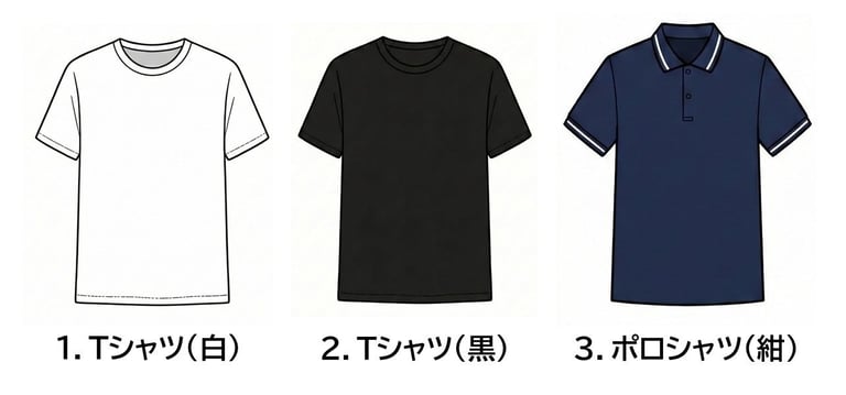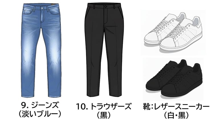 解決策: 「インナー5着、アウター3着、ボトムス2着」の計10アイテム(+白スニーカー)があれば、計算上40通りの組み合わせが可能になる。