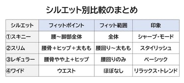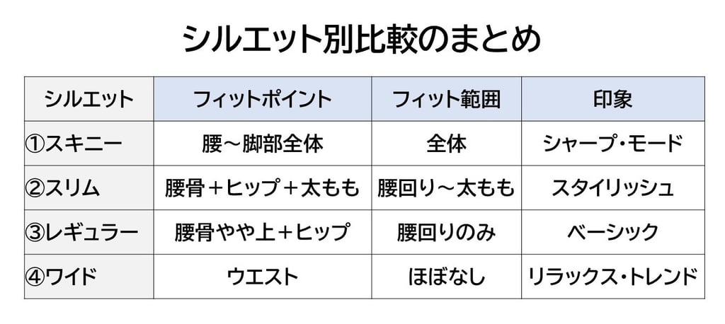 ※定番は②③④。①スキニーは近年やや落ち着き傾向ですが比較対象として扱います。