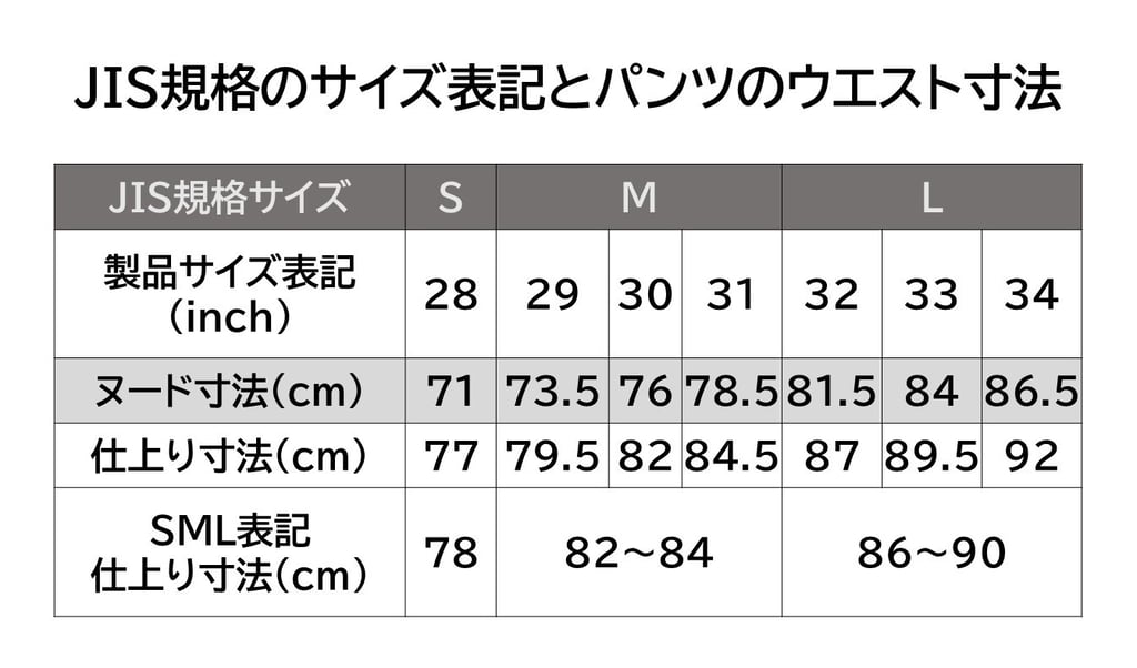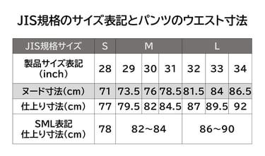 【図:JIS規格のサイズ表記とパンツのウエスト寸法】