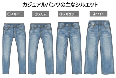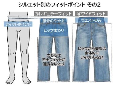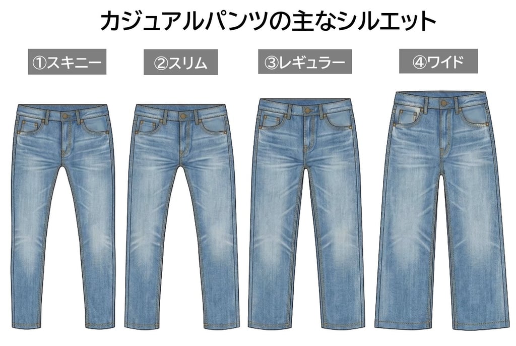 【図:カジュアルパンツの主なシルエット(5ポケットジーンズの例)】