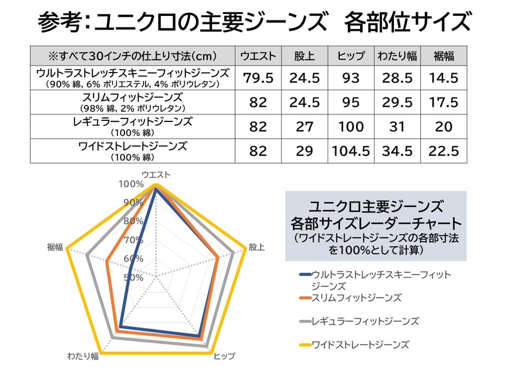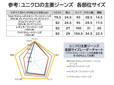【図:ユニクロの主要ジーンズ比較、レーダーチャート】