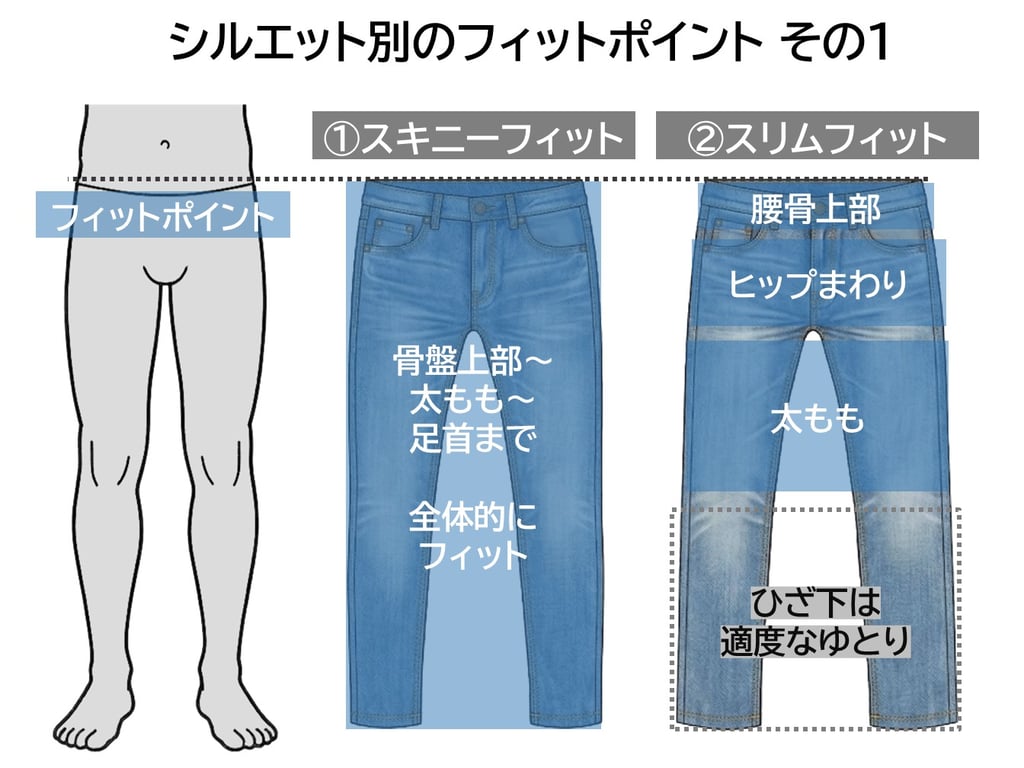 【図:シルエット別のフィットポイント-1 スキニー、スリム】