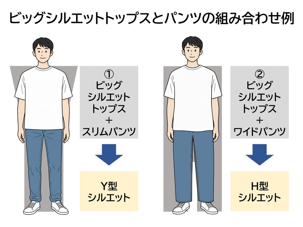 【図:ビッグシルエットトップスとパンツの組み合わせ例(スリム、ワイド)】