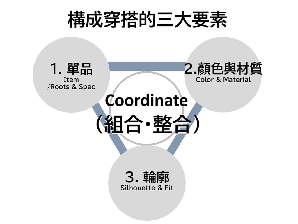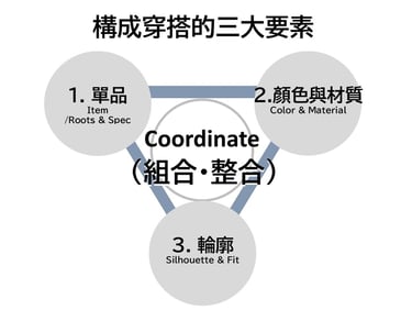 基本結構: 時尚穿搭並非無窮無盡的組合,而是由「單品」、「顏色與材質」、「輪廓(剪裁)」這三個變數所構成的邏輯結構物。